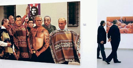 就在另一幅作品中,布达耶夫还将布什绘画成赤裸猛男,在查韦斯、卡斯特罗等领袖前展露一身肌肉,令人看了会心一笑。