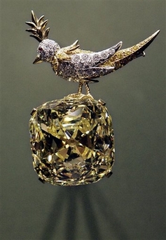 此次最受世人瞩目的蒂梵尼黄钻石重128.54克拉,经过人工雕琢,巨钻上是一只小鸟,因此取名为“石上鸟”,于上个世纪60年代初期由施伦伯格(Jean Schlumberger)设计。黄钻石上的鸟用黄金和白金制成,小鸟的眼睛也是用名贵的红宝石制作(见图)。这块黄钻石目前没有估价。据美国珠宝鉴定专家说,这是迄今为止在美国展出的最大钻石。