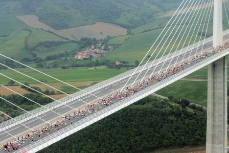 中新网5月14日电 综合媒体报道,法国13日举行了一场别开生面的马拉松赛,数万名参赛者要穿过世界最高斜拉桥密佑高架桥。该桥横跨法国南部城镇密佑附近的塔恩河上的山谷,高343米,甚至高过了埃菲尔铁塔而且仅仅比帝国大厦低38米,堪称世界最壮观的公路桥。