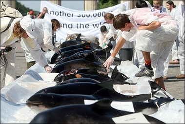 据台湾媒体报道,绿色和平组织成员将一具具鲸鱼、还有海豚的尸体从卡车上搬运下来,放置在德国柏林的勃兰登堡广场中央。放置在广场当中的鲸鱼以及海豚的尸体总共有17具,绿色和平组织成员当中的海洋专家指出全球每半小时就有17只海豚或鲸鱼被猎杀。