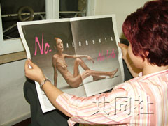 这则广告印有“拒绝厌食症”的广告语和一张骨瘦如柴的女性照片。除了平面媒体外,意大利街头也出现了许多相同的广告牌。据悉,照片中的模特27岁,从13岁起便是厌食症患者。
