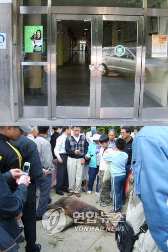 据韩联社报道,这头野猪打碎校楼正门的玻璃窗后闯进了学校楼,并在一楼的走廊和操场上乱串。接到报案后赶到现场的警官、消防官和韩国狩猎协会会员们利用猎犬展开追击,最后在学校的后山擒获了这头野猪。