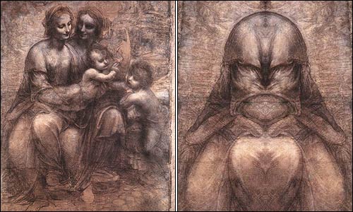 画作“圣母子与圣安妮”中,似乎也反射出类似影像。专家说,达芬奇打算藉画作表现出上帝本身,并且激发恐惧。在“施洗者约翰”画作中也藏着另一幅图像,。而以镜子反射“最后的晚餐”,似乎也会发现圣杯倒放在桌上。