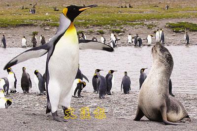 冤家聚头?图中的国王企鹅体形比软毛海豹大,肯定不会像文中的企鹅那样好欺侮。(资料图)