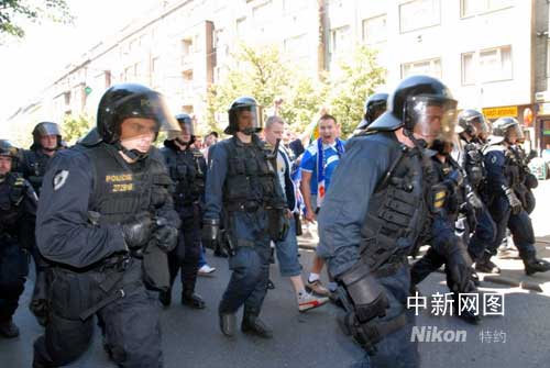 资料图片:布拉格警察在一次制止球迷闹事的行动中。(黄频 摄)