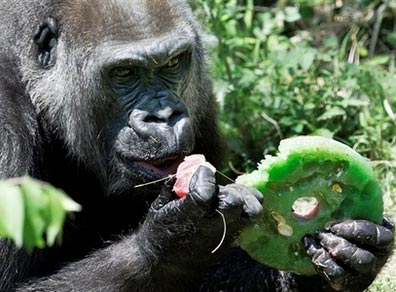 5月8日,美国达拉斯沃思堡动物园的工作人员为目前在世的世界上年龄最大的猩猩庆祝55岁生日。工作人员将一块四层的冰冻水果蛋糕和香蕉叶包裹的甜点作为生日礼物送给这位“老寿星”。