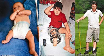 盖斯(左)11个月大的时候,便接受了第一宗手术;每天要忍痛扭动支架上的螺丝4次,将断掉的胫骨拉长(中);终于如愿以尝可独立行走(右)。