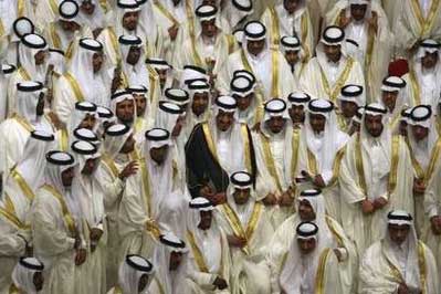 身着传统服装的沙特新郎,穿黑衣者为利雅得省长撒拉曼亲王。(图片来源:国际在线)