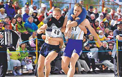 背老婆大赛据称起源于19世纪末的偷女人习俗,不过演变至今,已经成为芬兰夏日吸引观光客的著名活动。(王婷婷)