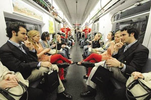 日前,15对同卵双胞胎按照亚当斯的要求,一起在纽约市布鲁克林桥的地铁站碰头,15对同卵双胞胎走进地铁车厢后,每对双胞胎都排着队各自坐在了过道两侧的座位上,并且每个双胞胎要直接面对着自己的双胞胎兄弟或姐妹。当15对双胞胎“各就各位”后,他们接下来要做的事就是尽可能保持动作一致,如果一个双胞胎用手挠头,那么他的同卵双胞胎也必须用手挠头;一个双胞胎看报纸,他的同卵双胞胎也必须低头看报纸。总之,他们就好像是对方的“镜中影像”一样。这些同卵双胞胎还被告知,如果有乘客询问他们到底发生了什么事,他们要表现得一无所知,甚至好像压根没看到坐在自己对面的同卵双胞胎一样。