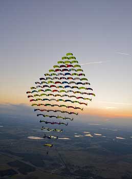 据报道,为实现这一绝技表演,100名跳伞队员进行了7年的计划和训练。他们从5架不同飞行高度的飞机上跳下,在美国佛罗里达几千英尺外的高空上拼成巨大的菱形,表演壮观惊人,引人注目。