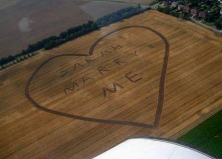 27岁的Robert Szabo在麦田里刻下一行大字:莎拉,嫁给我,然后他再“哄骗”其青梅竹马的女友坐上一架小飞机飞上麦田上空。当与他交往10年的女友看见了这一巨幅的真情告白时,她震惊了,感动地答道:“我愿意”。