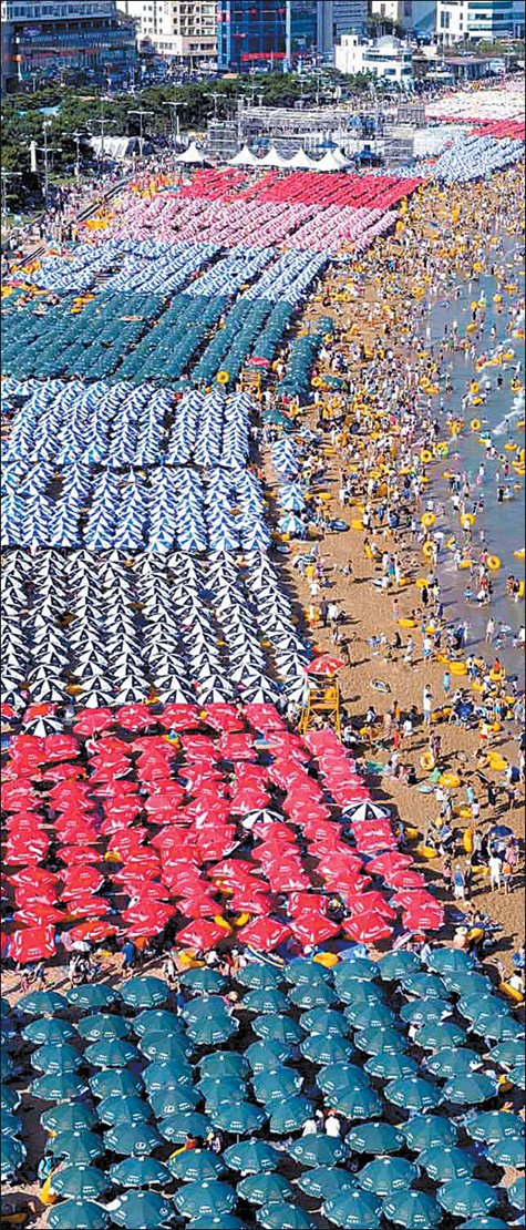 8月3日釜山海云台海水浴场迎来避暑高峰期。在长达1.5公里的沙滩线上,形形色色的海滨遮阳伞连绵不绝,蔚为壮观。继前一天100万名避暑客之后,当天避暑客的数量达到了90万名。