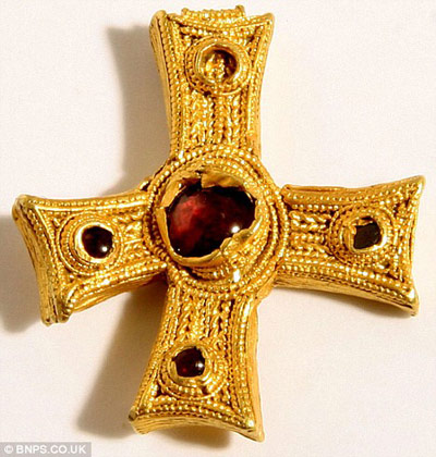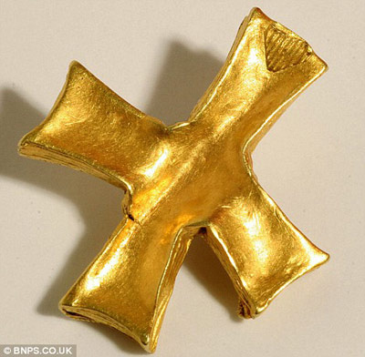 英国一男子日前无意中用金属探测器发现了一个距今1400多年的公元7世纪时的纯金十字架,专家估计价值至少2.5万英镑。
