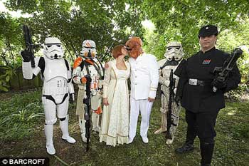 中新网8月13日电 据英国《每日邮报》报道,美国一对情侣丽贝卡和比尔超级迷恋电影《星球大战》,为此他们在结婚当天办了一场星球大战式的婚礼。