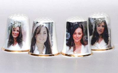 总部设在英国的一家中国顶针制造商的设计人员近日设计出一套以凯特为主题的顶针。每个顶针上都印有凯特的笑脸,而且每个顶针上的图案都不同:凯特戴着不同款式的帽子。由于图案有所区别,更增加了这套顶针的收藏价值。目前每套顶针的售价是4.40英镑。