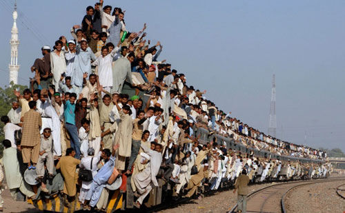 据英国《每日邮报》11月2日报道,11月2日数十万巴基斯坦逊尼派穆斯林结束了在坦木尔坦的宗教活动,乘火车返家。由于返乡的乘客太多,多数乘客不得不爬到火车顶上或挂在车厢外边,采取各种高难度的动作和姿势搭乘火车回家,远远望去整列火车的乘客都像是在表演“杂技”,令人叹为观止。
