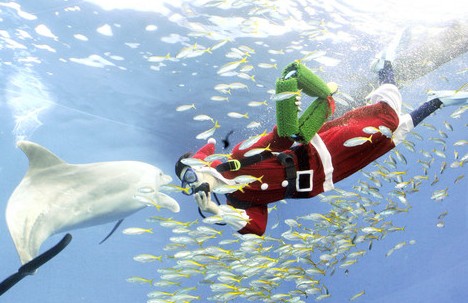 图文:日扮成圣诞老人的潜水员水族箱内喂白鲸