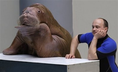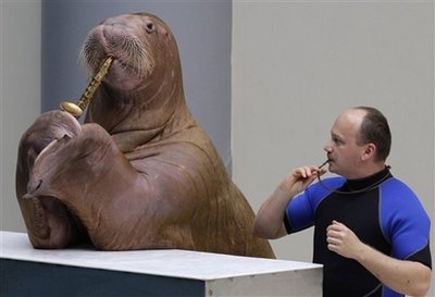 雌性海象“萨拉”在它的俄罗斯籍训练员谢尔吉指示下,用一只鳍足捡起一件类似箫的铜管乐器吹奏。