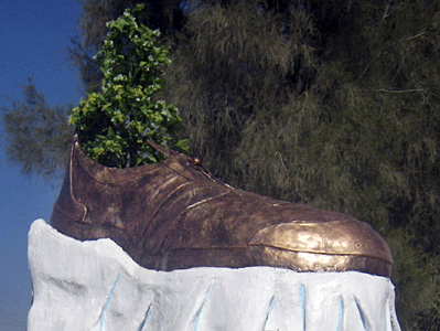 据香港东方日报即时新闻消息,巨鞋雕像竖立在被处决前伊拉克独裁者萨达姆的家乡提克里特,雕像种植了1株3米高的大树,并坐落在1个白色的底座。