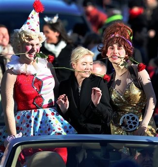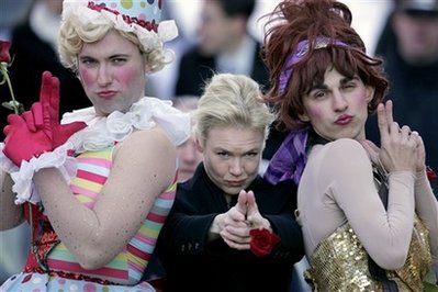 中新网2月6日电 据美联社报道,5日哈佛大学的速食布丁剧团将速食布丁年度女性大奖授予女星蕾妮•齐薇格。蕾妮•齐薇格按照以往惯例,带领一群男扮女装的学生们在哈佛校园中进行一场盛大游行。
