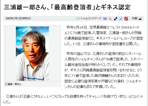 去年5月26日,当时75岁的三浦一郎成功登顶珠穆朗玛峰。据悉,之前吉尼斯世界纪录珠峰最高龄登顶者也是一位日本登山家,名为柳泽胜辅,2007年以71岁高龄登顶成功。