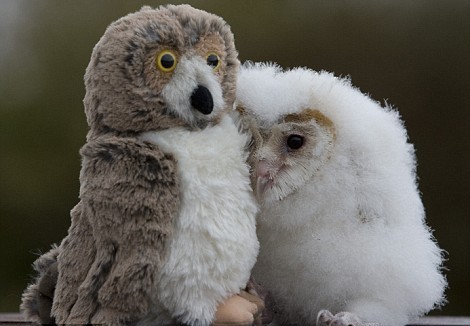 据英国《每日邮报》报道,一只仅有数周大的谷仓猫头鹰孤儿与一个猫头鹰填充玩具成了好朋友。
