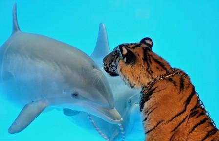 孟加拉雌性幼虎阿卡萨只有6个月大,而海豚马利克则已有1年2个月大。据游乐园工作人员介绍,小虎阿卡萨是在被饲养员带领散步时结识到了这位海豚好友。