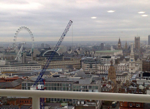 今年40岁的德里克-伯登(Derek Burden)在伦敦西区的科芬园的16层高楼处发现令人惊异的UFO景象,拍摄时间是早上8点30分。但是伯登只用手机拍摄了一张照片,这件事发生在几天前,当时他的妻子莎拉注意到厚云层的太空中隐约出现了几个特殊形状的飞行物,伯登说:“当时我正在等即将送来的一些材料,我便忙中偷闲去阳台喝杯茶,依据妻子所描述的不明飞行物,我在16层楼拍摄起来十分方便。”他还指出,这4个UFO释放的光线并不是任何典型的光线折射,并证实在拍摄时身旁并没有任何特定光源进行伪造拍摄。
