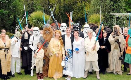 这对新人邀请了50名宾客在怀特岛举行了婚礼,他们打扮成 “绝地武士”和“帝国士兵”,而分别装扮成莱娅公主以及汉•索洛的新娘和新郎才是当天真正的主角。