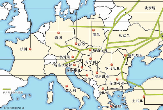 俄罗斯除依靠上述三条管线直接向所经国家输送天然气外,还通过欧洲各国天然气管道网络,将天然气输送到法国、英国、意大利等其他欧洲国家。