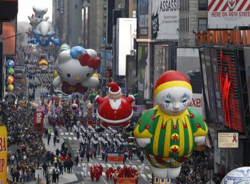 梅西感恩节大游行由美国梅西百货公司主办,在感恩节当天举行,持续时间约三小时。二十六日上午九时,一万多人的游行队伍从七十七街和中央公园西大道交会处出发,为游行揭序幕。游行队伍中还包括一千五百多名拉拉队员、八百名小丑、十支乐队以及二十四个巨型卡通形象气球。近百万人在沿途观看,另有数千万民众通过电视转播观看游行盛况。