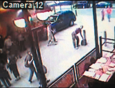 纽约警方在距现场半个街区的闭路电视录影中,发现一名怀疑是疑凶的白人男子。片段中,男子一边回头望向涉案日产Pathfinder的方向,一边脱掉深色T恤,露出里面的红色T恤,然后将深色T恤放入手提包后离开。