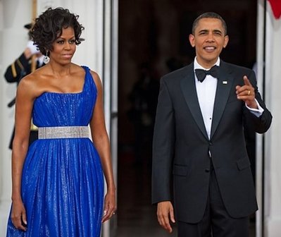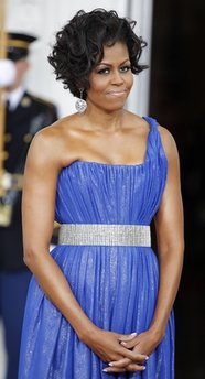 当晚,奥巴马夫人米歇尔再次闪亮登场,其着装打扮又被众媒体拿来评点一番。米歇尔穿了亮蓝色单肩拖地长裙,腰间系上银色腰带,并佩戴了银色耳环。