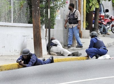 军警周二在金斯敦各处布防,并在西区继续沿街搜索,枪声不时响起。金斯敦的学校周二停课,商店停业。西区黑烟滚滚,武装直升机盘旋。目击记者称,3辆装满尸体的货车在一间主要医院的停尸间卸下尸体。