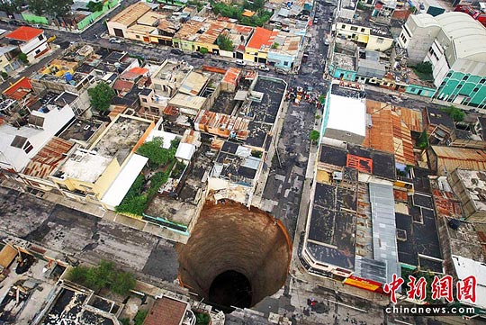 此外,受连场暴雨影响,危地马拉城一处出现地面下陷,形成一个深60米、直径30米的地洞。据报道,这个巨大地洞吞噬了一幢3层高大厦,1人死亡。