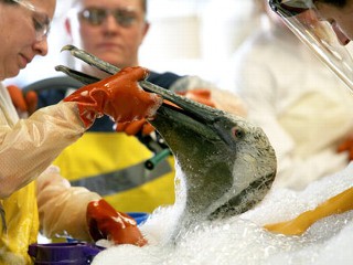 中新网6月9日电 据美国媒体报道,墨西哥湾漏油给当地鸟类带来致命影响,美国路易斯安那州的一间仓库已被用来清洗被原油包裹得无法动弹的海鸟。志愿工作者穿着防毒护具,一遍又一遍擦洗海鸟身上的深色原油。