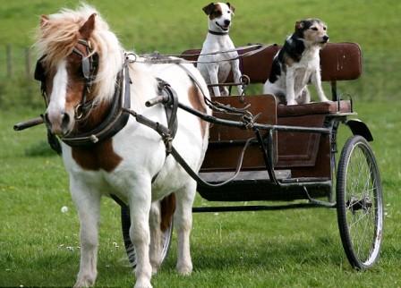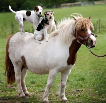 中新网5月11日电 老马向狗传授骑术?据英国媒体报道,英国的两只杰克罗素梗狗骑在老马身上有5年了,并向小狗传授骑术。