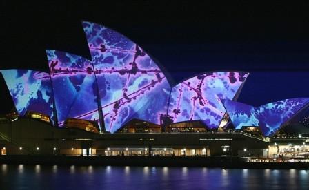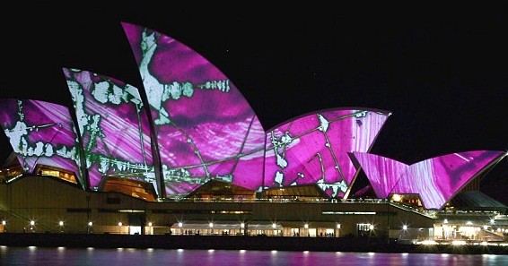 中新网5月28日电 据英国媒体报道,澳洲悉尼歌剧院举行一连3周的灯光节,七彩灯光射向歌剧院外墙,构成一幅幅千变万化的画像,犹如万花筒,为悉尼夜空增添缤纷色彩。