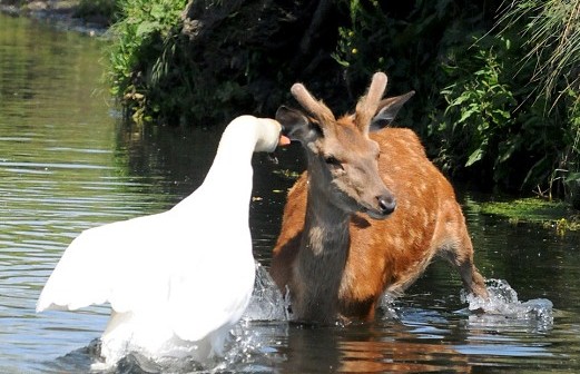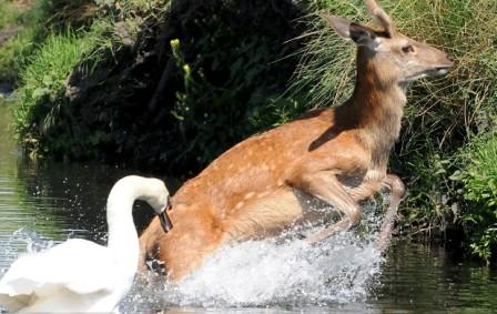 一只年幼的小鹿冒险在伦敦的Richmond公园里想小浸鹿蹄,不幸地是,该地盘内的主人天鹅却并不想和小鹿分享这一湖水,立刻对准小鹿的耳朵猛啄,用力捍卫自己的领土。尽管小鹿在体形上占据优势,但是小鹿最终还是不敌凶悍的天鹅,落慌而逃。