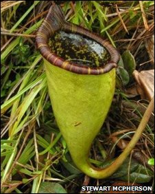 据英国广播公司报道,近日生物学家在菲律宾一处山峰发现一种罕见的巨型“食肉”植物,形状体态宛如一个诱捕昆虫的陷阱,它的瓶状叶可以捕食昆虫等动物。这种植物是以前从未发现的猪笼草新品种,甚至可以把老鼠给“吃”掉。生物学家将此次发现的详细情况刊登在了林奈学会《生物学杂志》上。