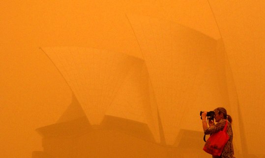 澳洲东部星期三遭遇数十年来最严重的沙尘暴,悉尼市被覆盖,交通受阻。强风把数以吨计的红色沙尘倾倒在澳洲最大城市悉尼,使悉尼覆盖在怪异的赤色迷雾中,著名悉尼歌剧院被涂上一层厚厚的沙尘。