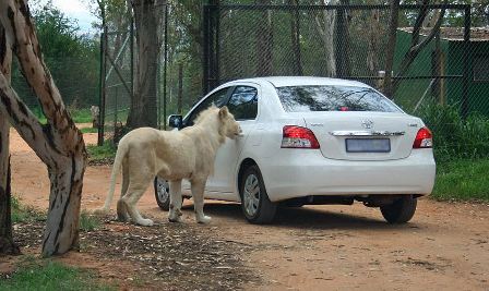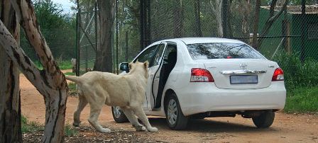 据报道,在南非约翰内斯堡野生狮子动物园,一辆白色丰田车的车主粗心大意,没有按照园方叮嘱锁好车门,结果真的让一头狮子“盯上”了。这只重约136公斤的狮子走近汽车,用嘴来回摸索,竟然用牙齿咬住了车门的把手,将车辆左后方的车门拉开了。而车主尚在车内,被吓得一动也不敢动,完全惊呆了,像是难以置信。