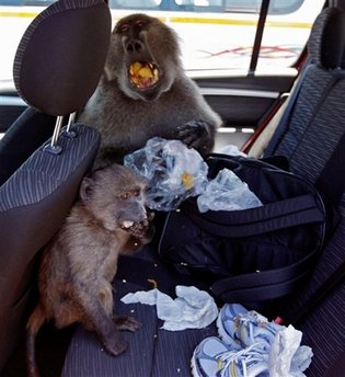 25日,一群游客开车前往南非历史悠久的海滨小镇西蒙镇,其中4辆车辆遭到狒狒袭击。一共有多达29只狒狒在其首领——外号为“弗雷德”(Fred)的狒狒带领下打开未上锁的车门,闯入车中“大闹天宫”,将游客们的食物三明治、零食等吃个精光,并弄得车内一片狼藉。还有不少狒狒爬到车顶、车前玻璃处,企图破窗而入。始料未及的游客们只能在车外观望,有人担心自己放在车内的护照被狒狒撕烂,有的小孩被狒狒吓得大叫。