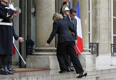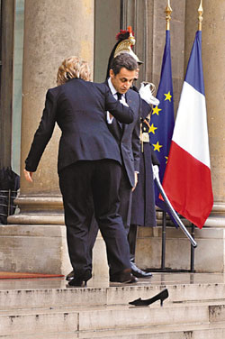 中新网1月30日电 据香港《文汇报》报道,美国国务卿希拉里29日到达法国巴黎,与法国总统萨科齐讨论欧盟区内的安全问题。在法国总统府外,希拉里踏上楼梯时竟然甩掉右鞋,需要萨科齐帮一把(图),其后接受献吻。