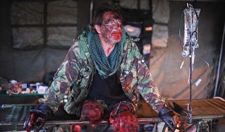 借助涂抹假血等化妆技术,斯威夫特看上去就像是一名刚刚在爆炸中严重受伤的士兵。他双腿齐刷刷地断掉,断腿裹着的绷带渗出血迹,周围还挂着被炸烂的肉、皮,有的地方骨头还露了出来。