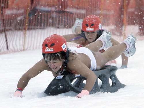 这场上空雪橇锦标赛吸引了30名年轻男女参赛,其中不乏前凸后翘的性感辣妹与身材壮硕的猛男。