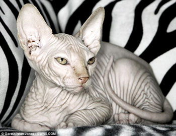斯芬克斯猫是2005年认定的稀有品种,它们无毛,满身褶皱。斯芬克斯猫脾气很好,而且在某些方面它们更像狗,比如,容易与人亲近而且对人忠诚。但是这种猫也需要些特殊保护。比如在夏天,主人需要给它们涂抹防晒霜以免晒伤;在冬天则需要给它们添加衣物来遮体保暖。斯芬克斯猫通常能活到9—15岁。