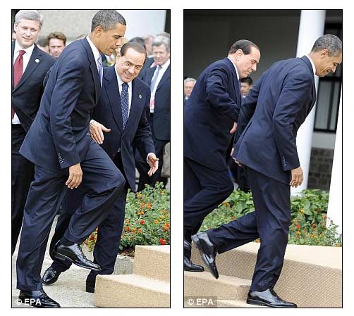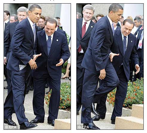 奥巴马日前到达八国峰会召开地——今年4月初遭受地震灾害的意大利中部城市拉奎拉。当时,身为主人的贝卢斯尼克立即伸出手问候美国总统。但是奥巴马却转头闭目,将稍稍抬起的右手放下,直接从贝卢斯科尼旁边走过,留下贝卢斯科尼一个人,尴尬地站在那里举着手。