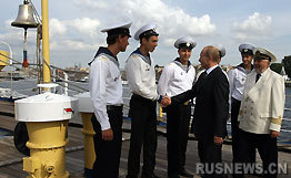 中新网7月13日电 俄新网消息,俄罗斯总理普京12日参观了训练用"和平号"帆船,该船在格丁尼亚-圣彼得堡国际帆船大赛第一赛段摘得了桂冠。普京是乘坐快艇登上帆船的。